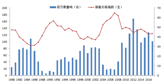 以2002年为分界线,过去三十年全球新船价格变动可分为两个周期,每个周期包括上升期和下跌期两个阶段。在前一个周期(1986-2002年),上升阶段价格累计增长80%,下跌阶段价格累计降低34%;在本周期(2003年至今),上升阶段价格累计增长74%,下跌阶段(到2016年)价格累计降低34%。